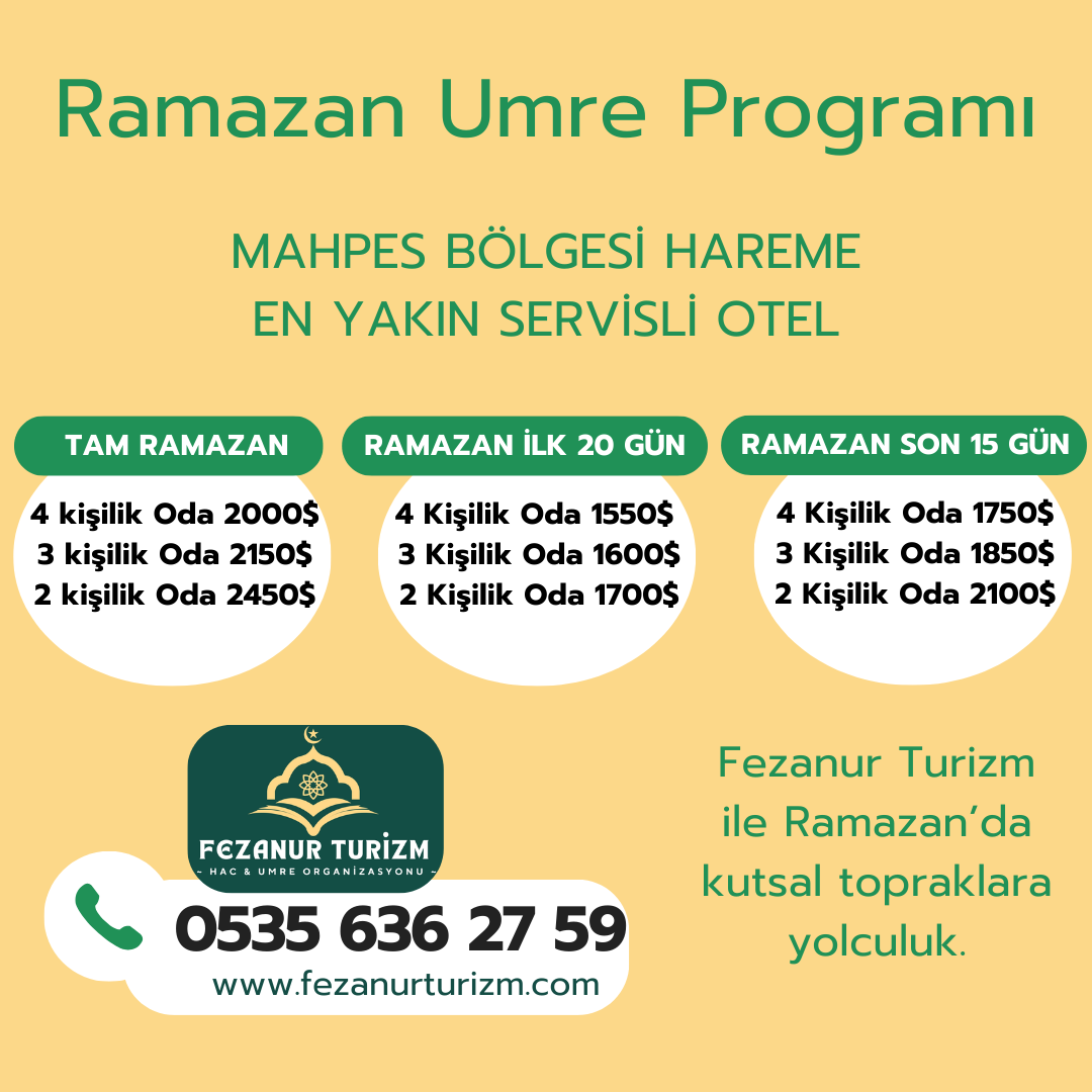 Fezanur Turizm olarak, kutsal topraklara yolculuk yapmak isteyen misafirlerimize en iyi hizmeti sunmayı amaçlıyoruz. Tecrübeli ekibimiz ve özverili rehberlerimizle, Umre turlarınızı ruhani bir deneyime dönüştürmek için çalışıyoruz. Yılların verdiği bilgi birikimi ve güven ile, misafirlerimizin tüm ihtiyaçlarını karşılayan kapsamlı hizmetler sunarak, huzurlu ve anlamlı bir yolculuk yaşamanızı sağlıyoruz.